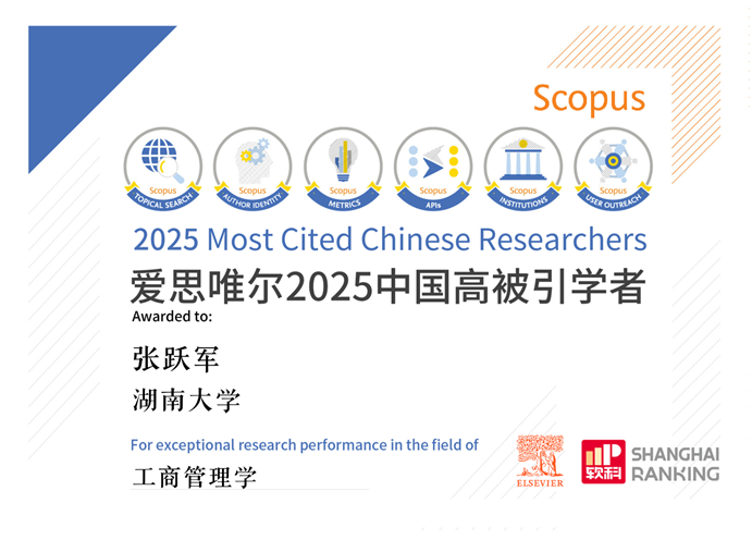 2026年1月30日,爱思唯尔(Elsevier)发布2025年度“中国高被引学者”(Highly Cited Chinese Researchers)榜单,研究中心负责人张跃军教授再次入选该榜单(工商管理学领域)。这是张跃军教授连续第六年入选该榜单。