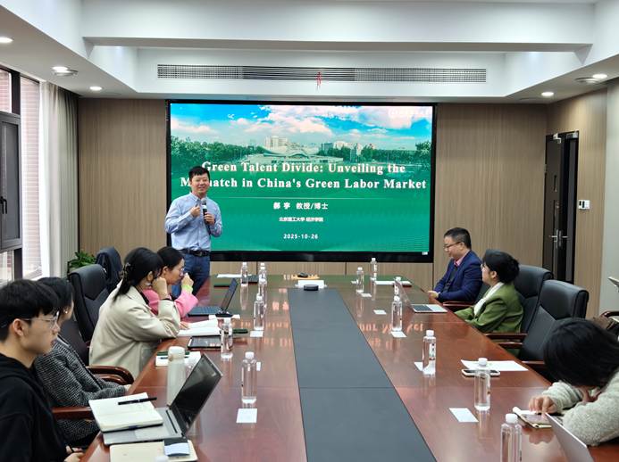 10月26日上午,北京理工大学经济学院郝宇教授应邀作题为“Green Talent Divide: Unveiling the Mismatch in China's Green Labor Market”的学术报告。研究中心张跃军教授主持报告会,工商管理学院教师、博士生和硕士生共40余人参加了本次活动。